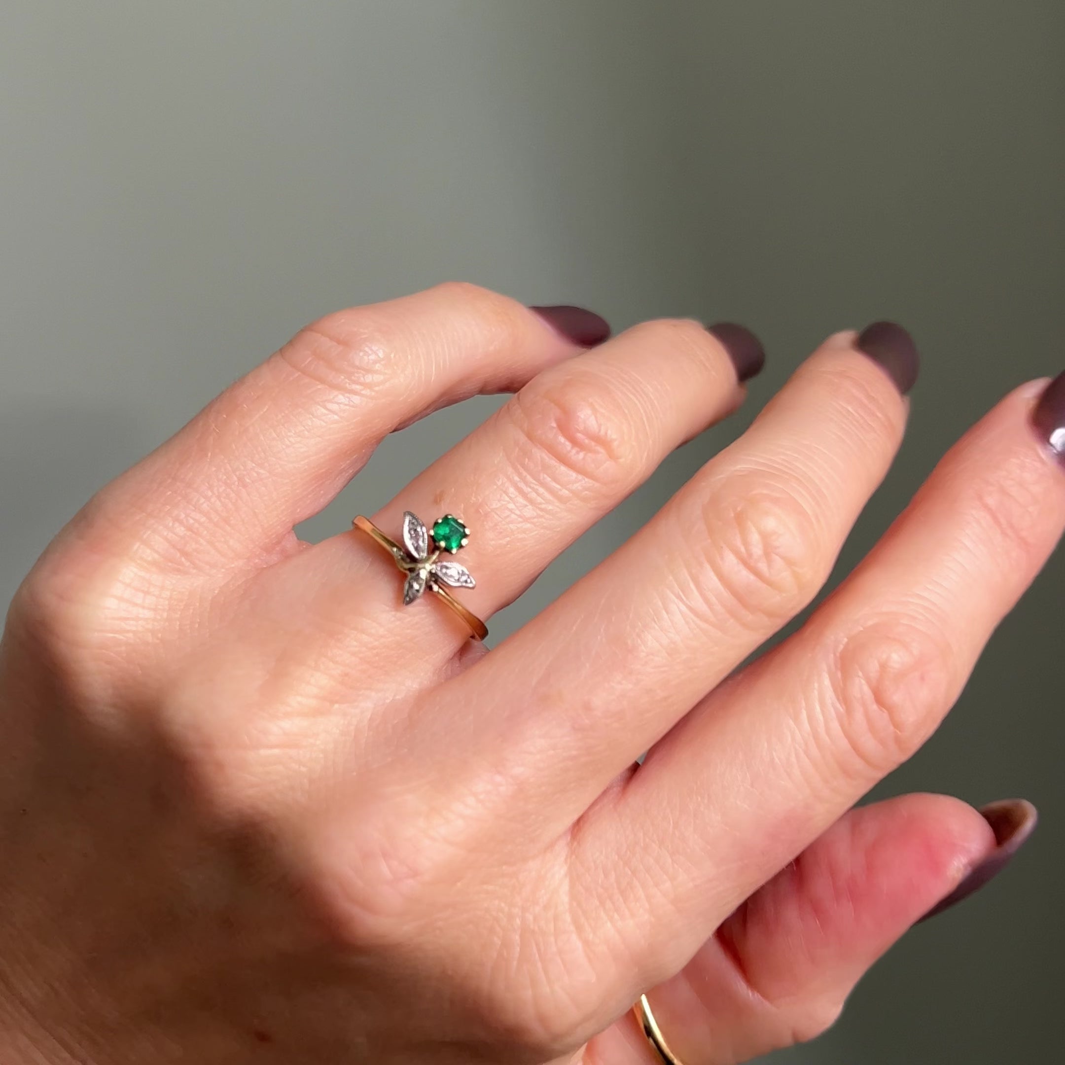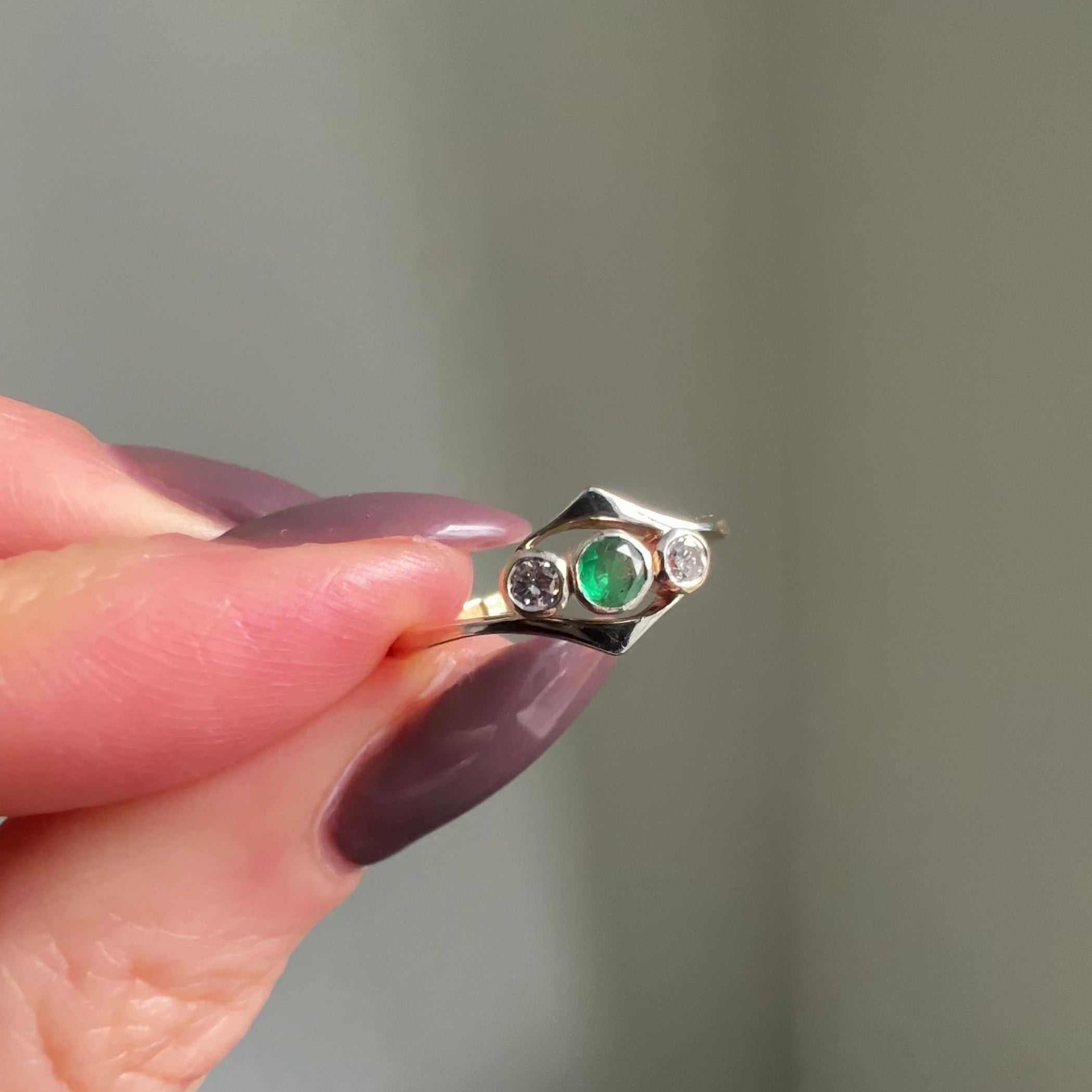 Antique Diamond and Emerald 3 Stone Ring, Platinum and 18ct Gold