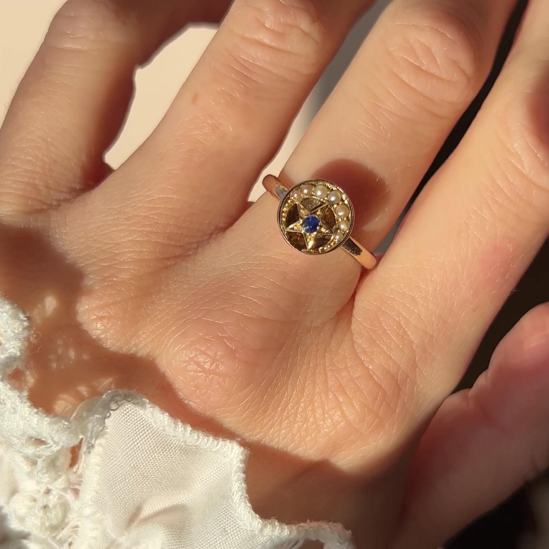 Sold outAntique 18ct Gold Sapphire Star and Pearl Moon Ring