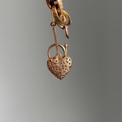 A wonderfully chunky and ornate 9ct gold bracelet, with foliate detailing on each link and a pierced love heart lock to keep it closed. An absolutely gorgeous statement piece.