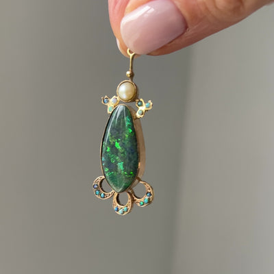 An unusual and unique pendant, featuring a tear dropped shaped opal, with ornate gold work and further opals and pearls. This is truly striking when worn, and the opals glow and have green and gold plays of colour.