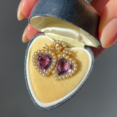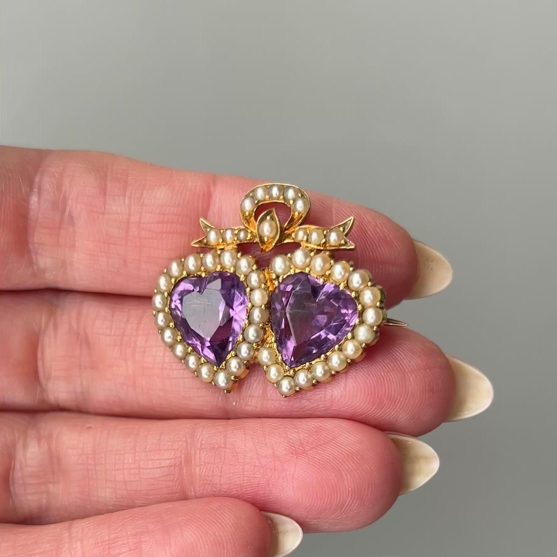 A very pretty double heart brooch, featuring 2 amethyst hearts surrounded by seed pearls and topped with a stylised bow. The hearts represent 2 lovers and this would have traditionally been a gift between close friends or sweethearts in the Victorian era.