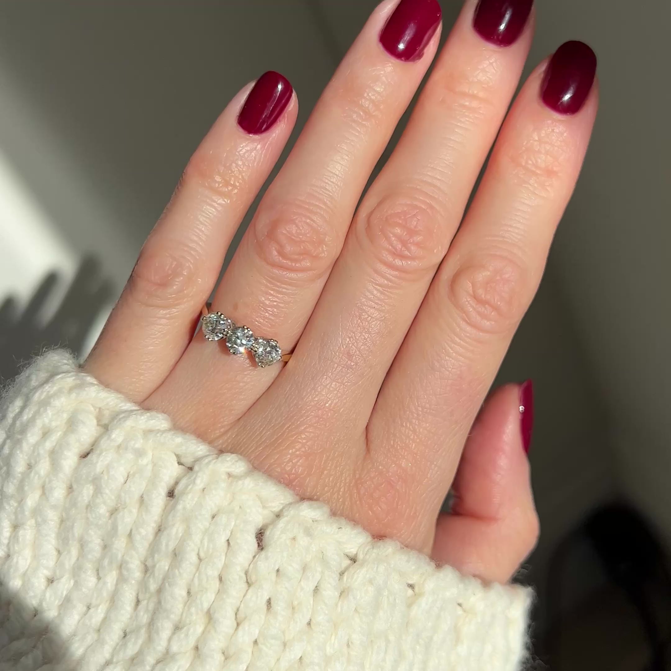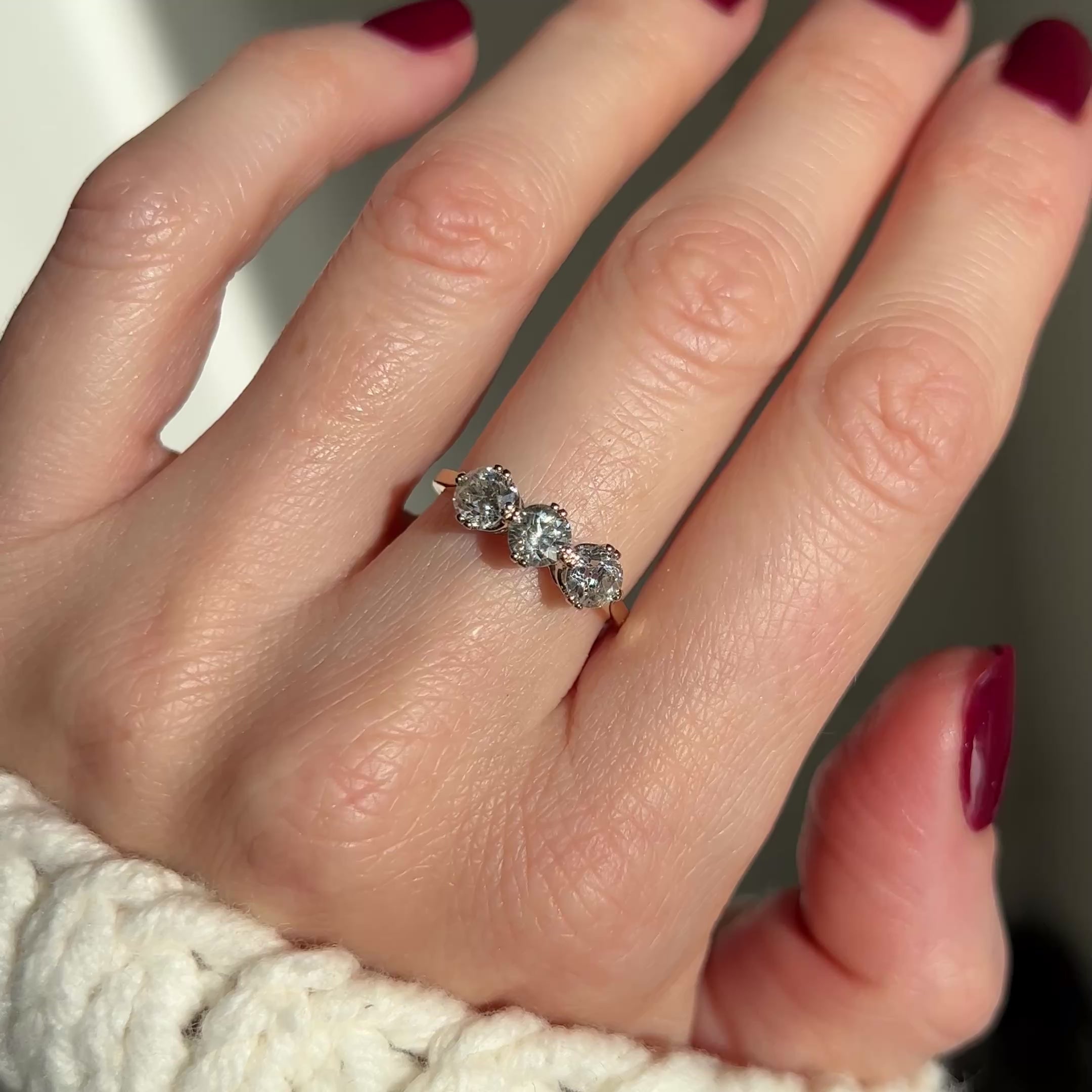 A beautiful diamond trilogy ring, featuring 3 old cut diamonds that total 1.50ct, giving you a nice spread of diamonds across the finger. They're all lively and fiery diamonds, set in platinum on an 18ct yellow gold band. Trilogy rings are said to symbolise the past, present and future through the 3 stones, so they have a lovely symbolic meaning.