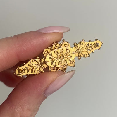 An Etruscan style Victorian era brooch, finely crafted in 15ct gold with detailed wire work and gold granulation making a beautiful floral pattern. In good condition with a working clasp and a glass compartment on the reverse.
