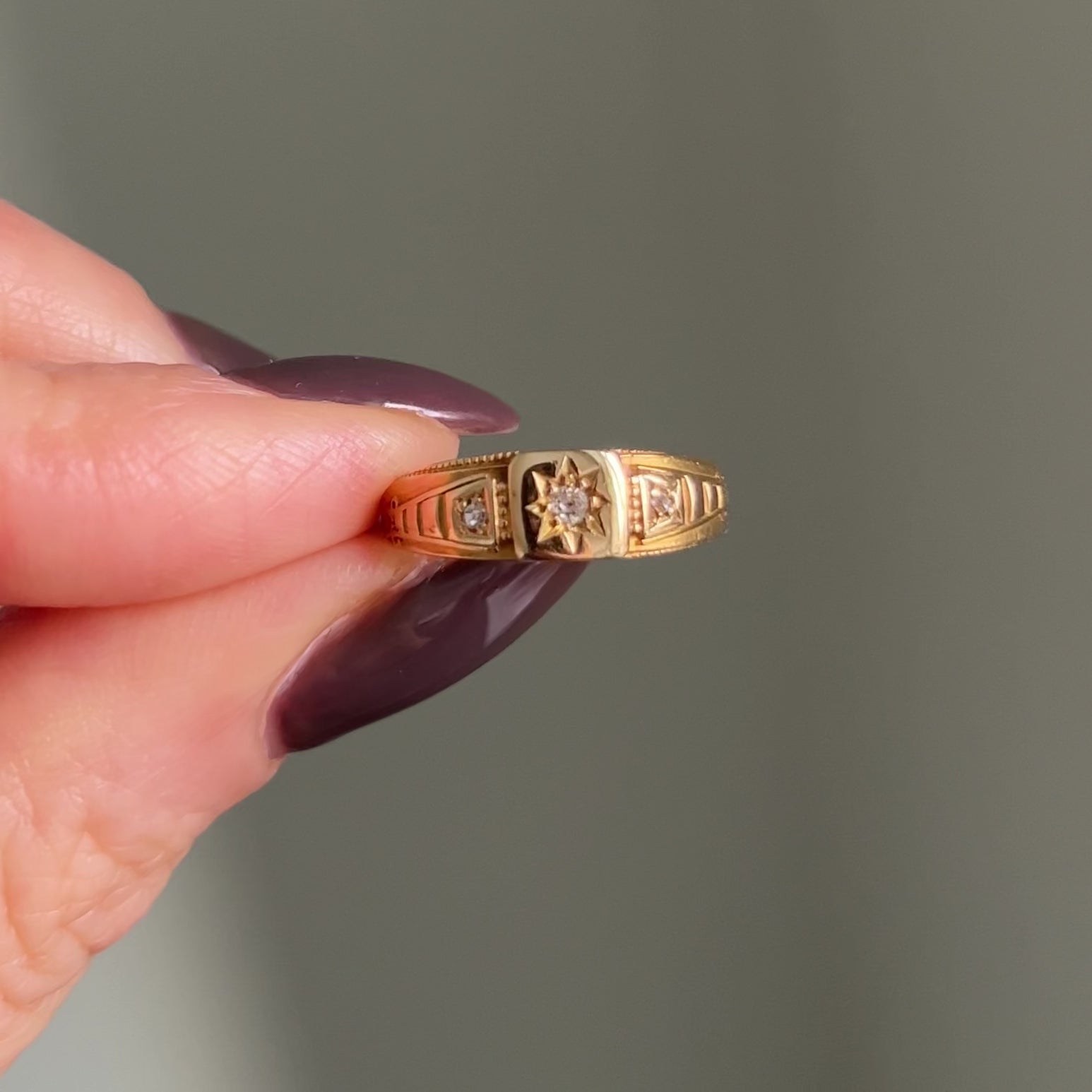 A perfect antique 18ct gold band, featuring a central diamond that is traditionally star set, and 2 more diamonds on ether side, and subtle details on the shoulders. Smooth and easy to wear; a great heirloom and everyday ring that looks great with other rings.