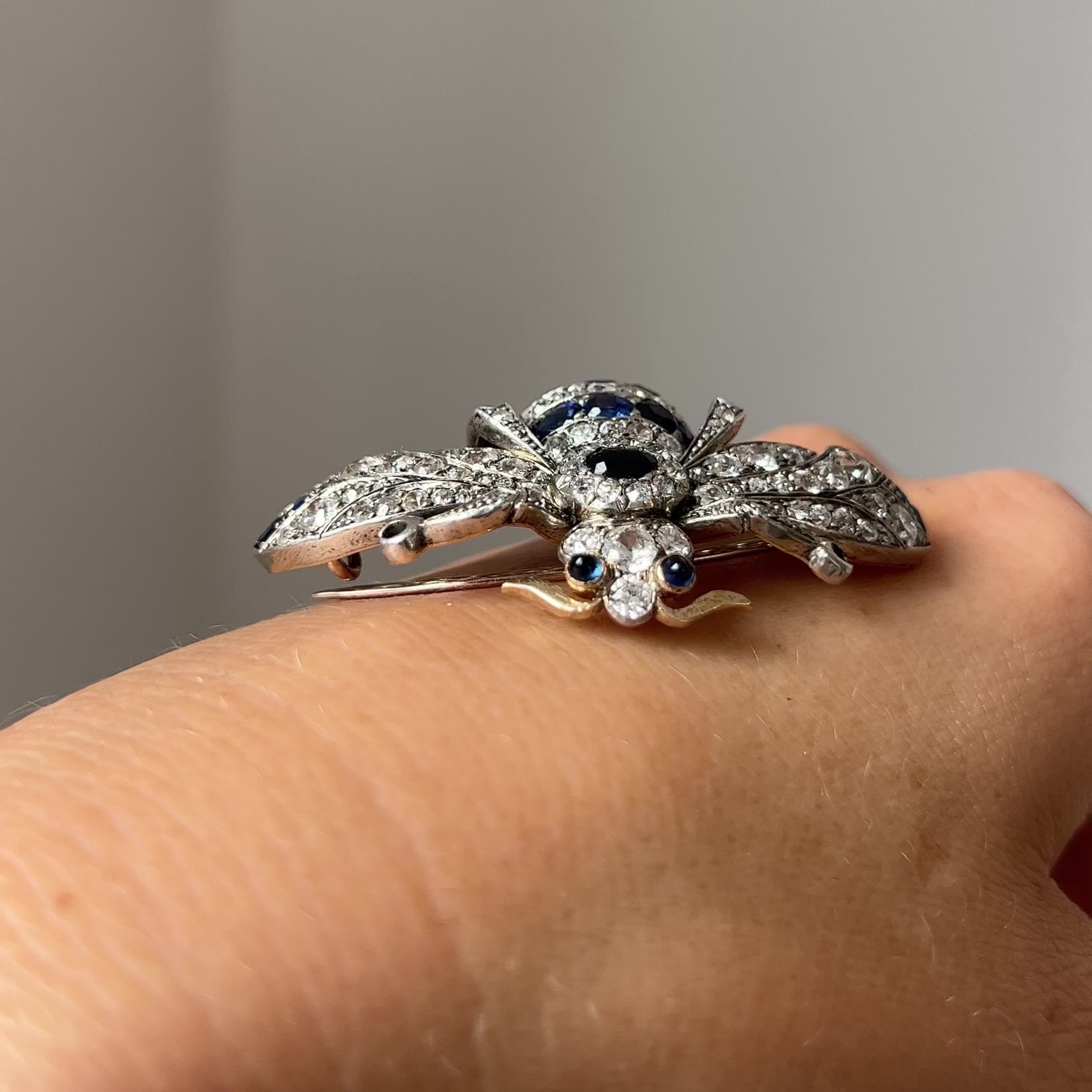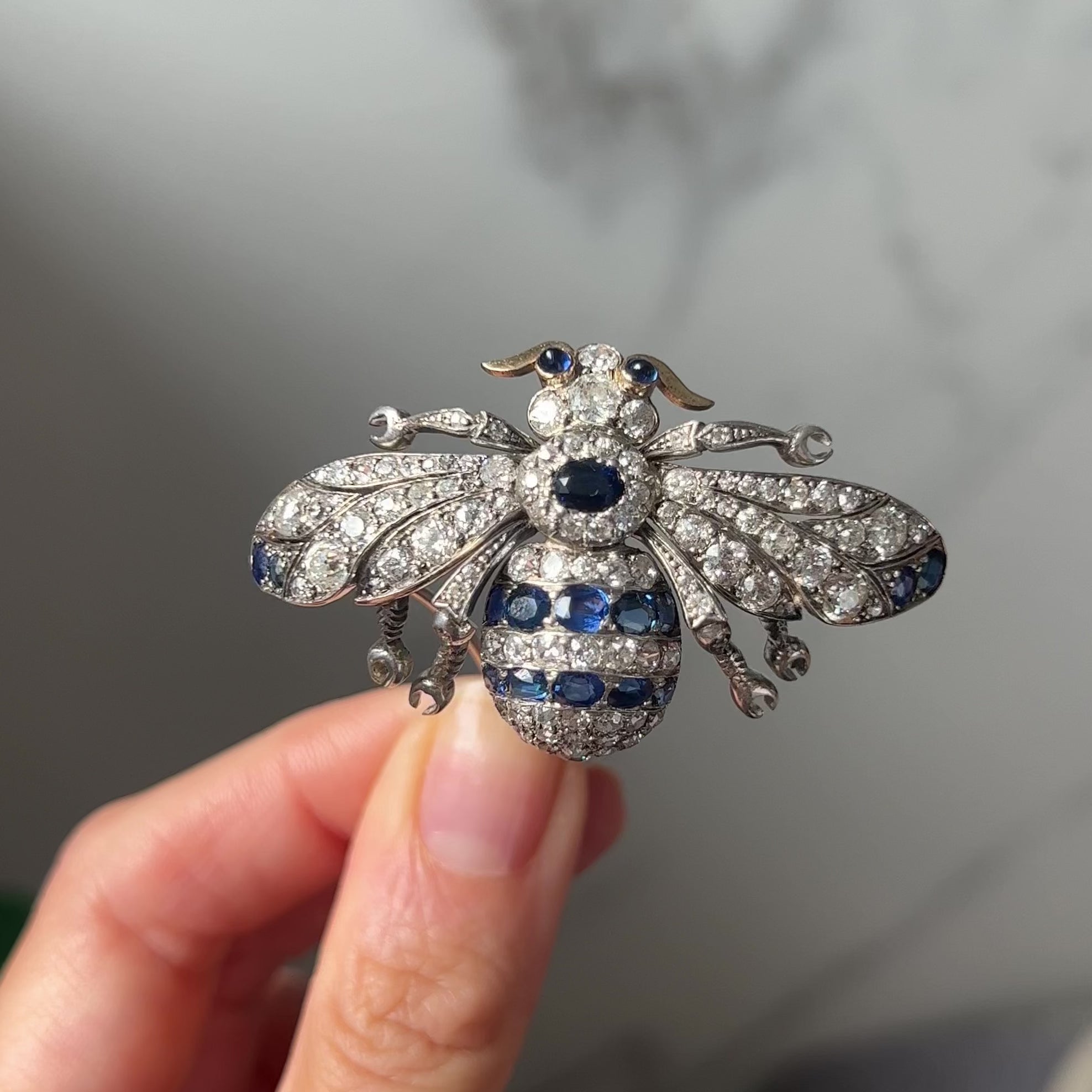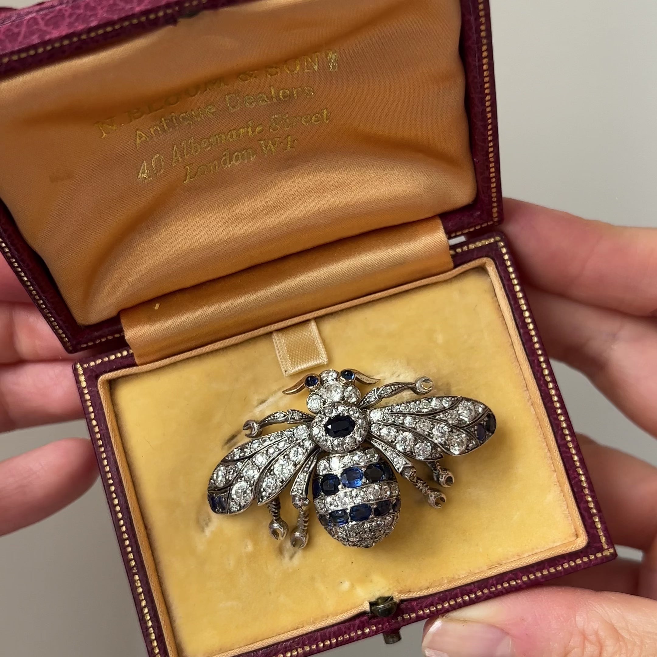 A beautifully crafted antique brooch, modelled in the shape of a bee and encrusted with diamonds and sapphires. This is an intricately made piece of jewellery and it's finely crafted with beautiful details on the face and every section of the body. It comes in it's original fitted box for N. Bloom and Son; an esteemed antique dealers in London established in 1912. Insects are a popular motif in Victorian jewellery; the era’s fascination with nature, coupled with industrial progress of the time and interest in ancient Egypt (where scarab beetles were symbols of good luck), contributed to the trend of insect-inspired jewelry. Bees in particular symbolised hard work, diligence and team work.