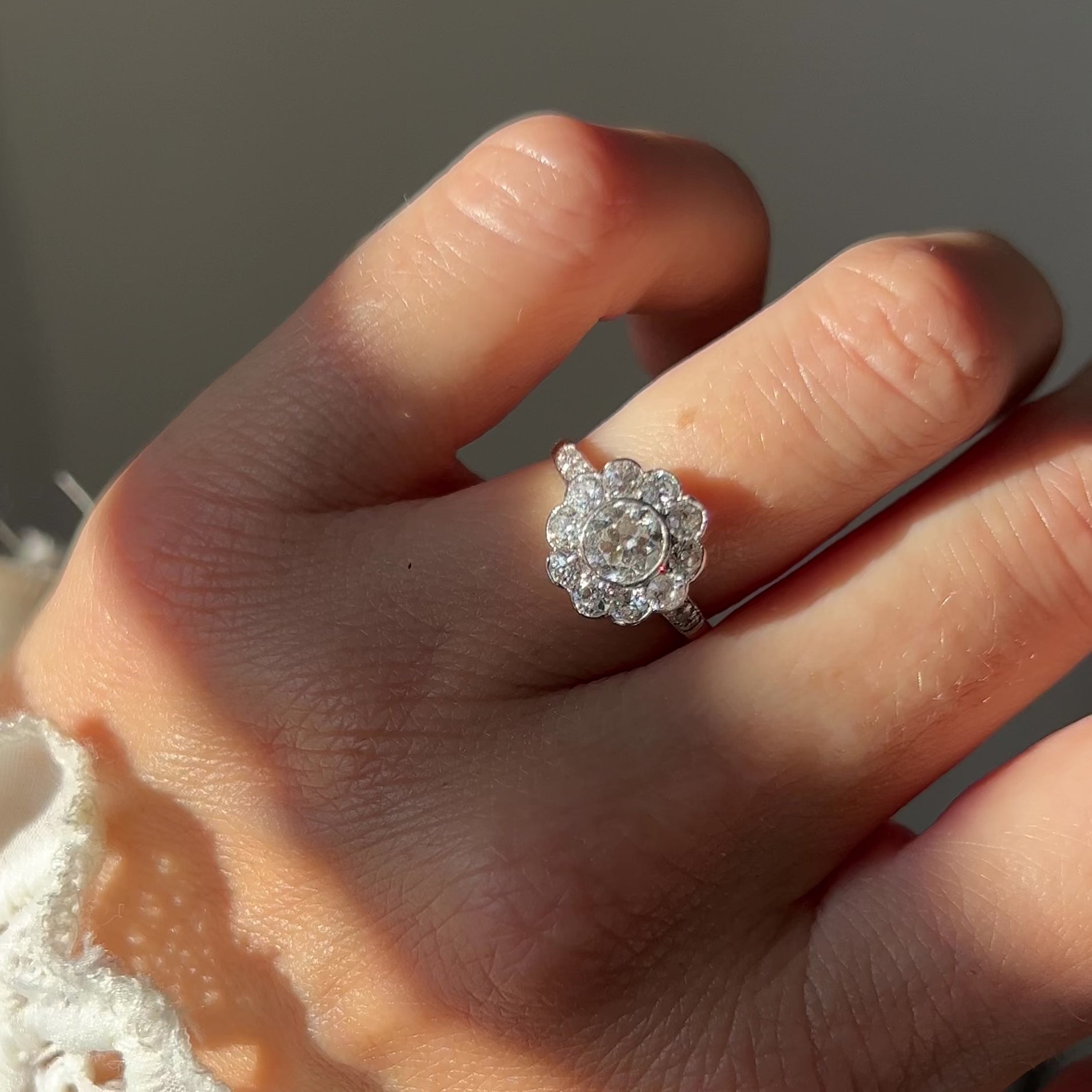 The prettiest antique diamond cluster ring, reminiscent of a daisy, dating to the early 20th century. The ring features a 0.50ct center old cut diamond and a 0.75ct surround, with further diamond details down the shoulders and set in platinum on a gold band. It's a perfect antique engagement ring or a pretty dress ring. The diamonds are all bright and well matched.