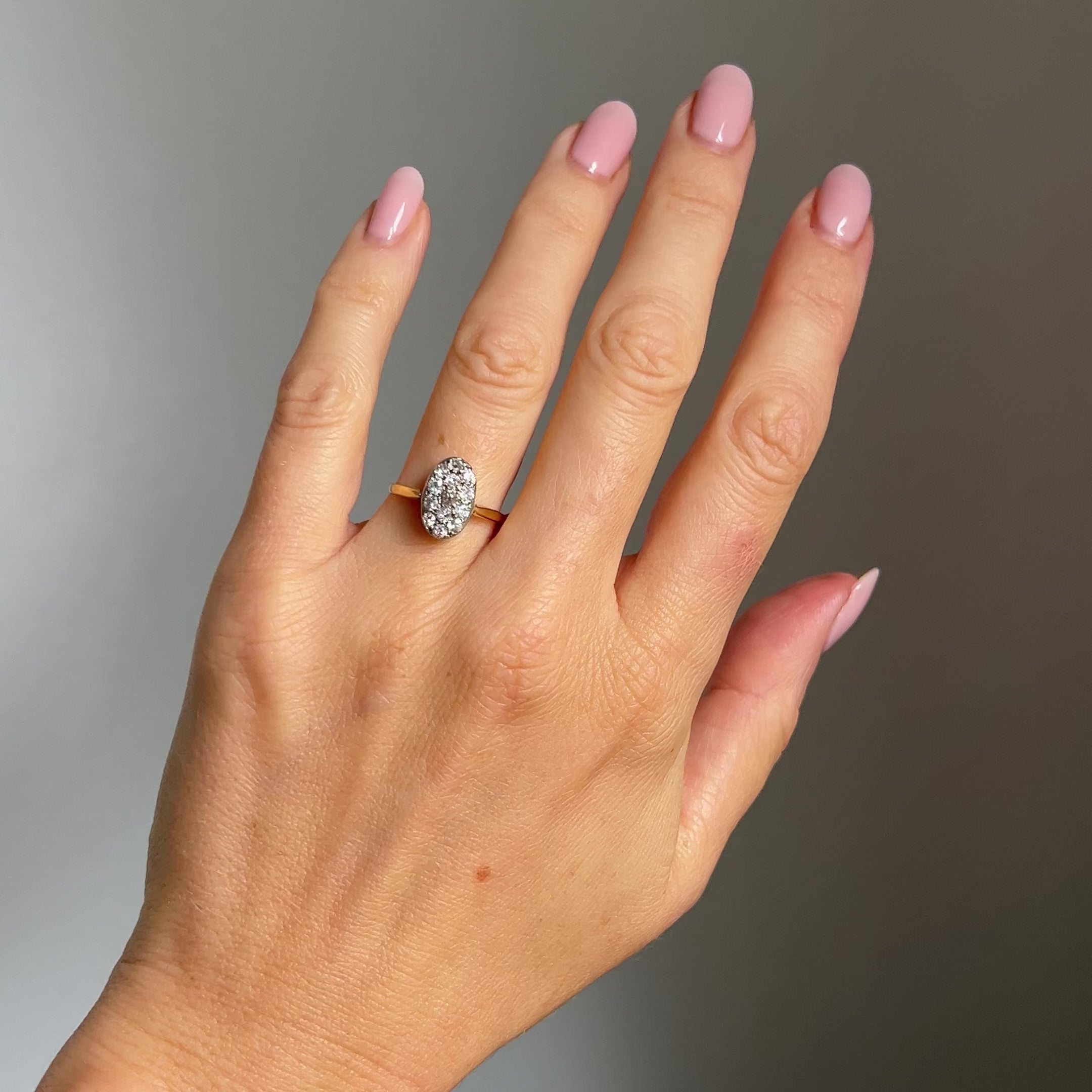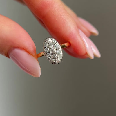 A beautiful and unusual diamond cluster ring, featuring a cluster of 13 antique old cut diamonds set in platinum in an oval shape on a yellow gold band. Dating to the late Victorian period.