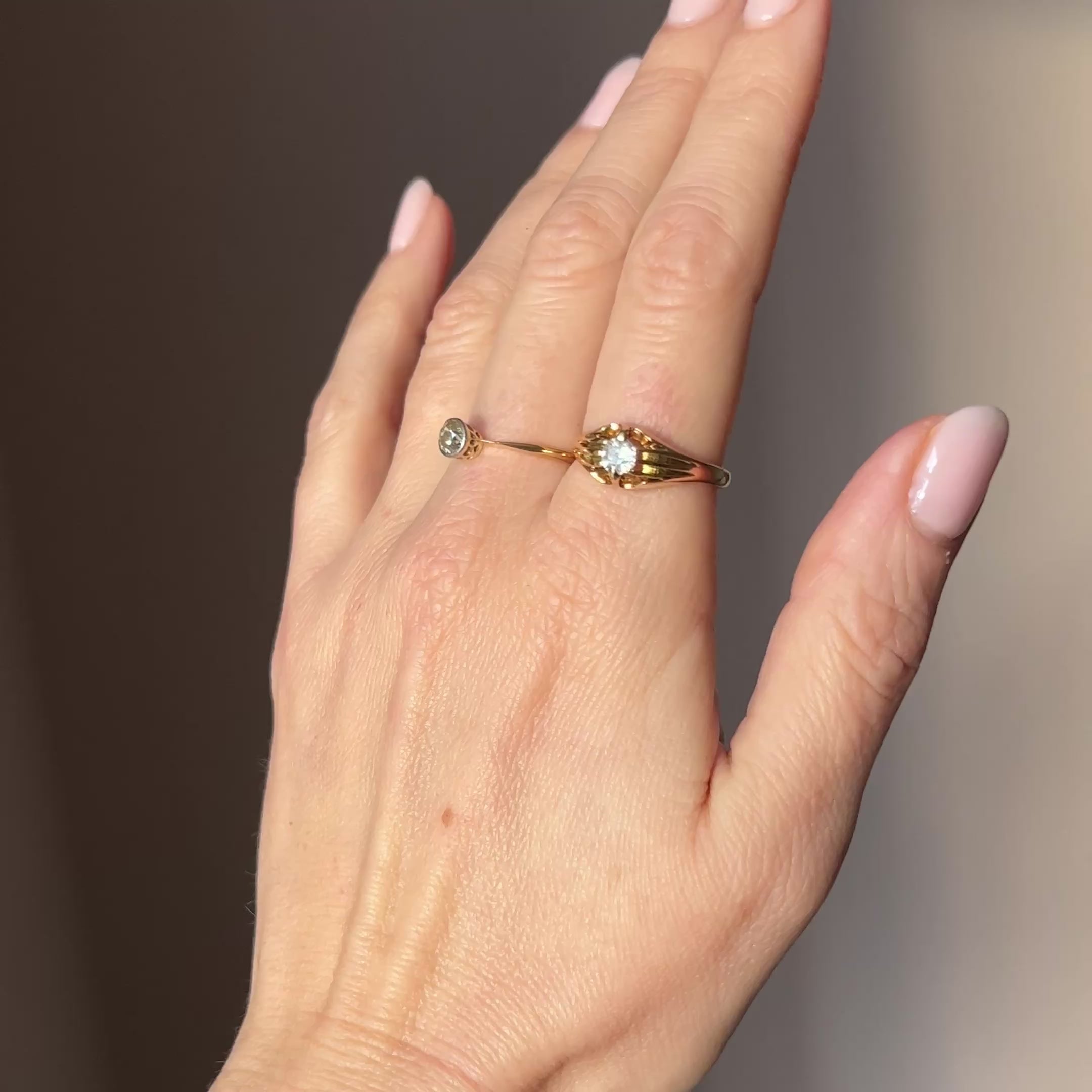A classic Victorian 18ct gold ring, with a diamond solitaire in the centre. The diamond is a characterful old cut and it's bright with some inclusions, claw set in the yellow gold.