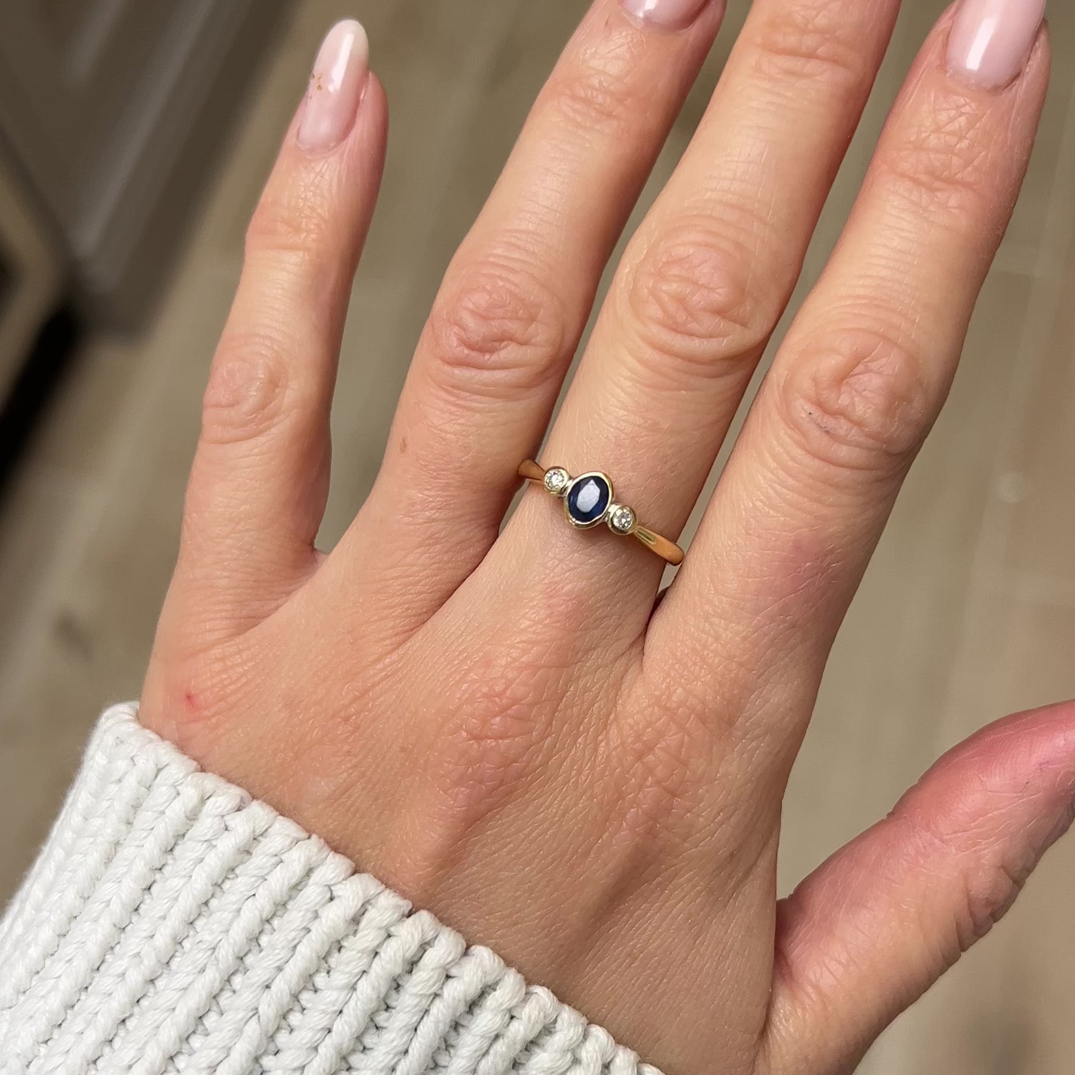 A classic sapphire and diamond trilogy ring, with 2 diamond stones and a central sapphire, bezel set in 18c gold. Smooth, dainty and easy to wear in good condition and nicely made.