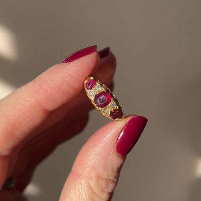 A beautiful 18ct yellow gold half hoop ring with 3 beautiful unheated rubies with 4 diamond separators. It dates to 1903 and has beautiful crisp hallmarks in the gold.