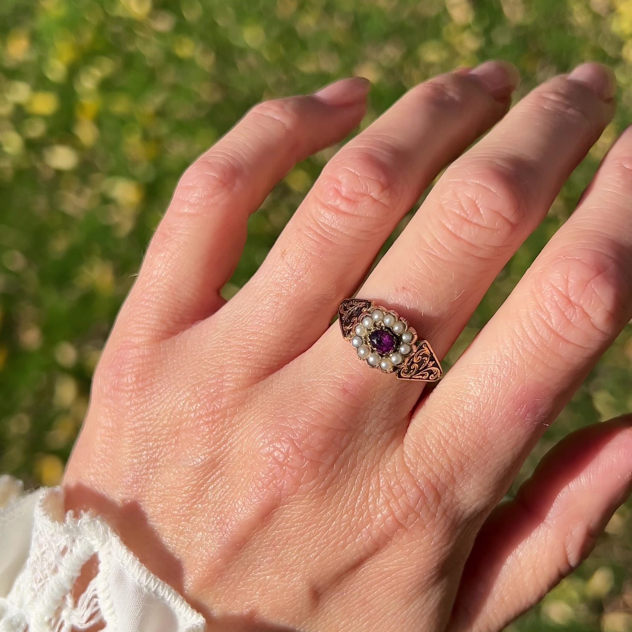 A delicate antique morning ring from the Victorian era, featuring seed pearls surrounding an amethyst with ornate enamel work on the shoulders.