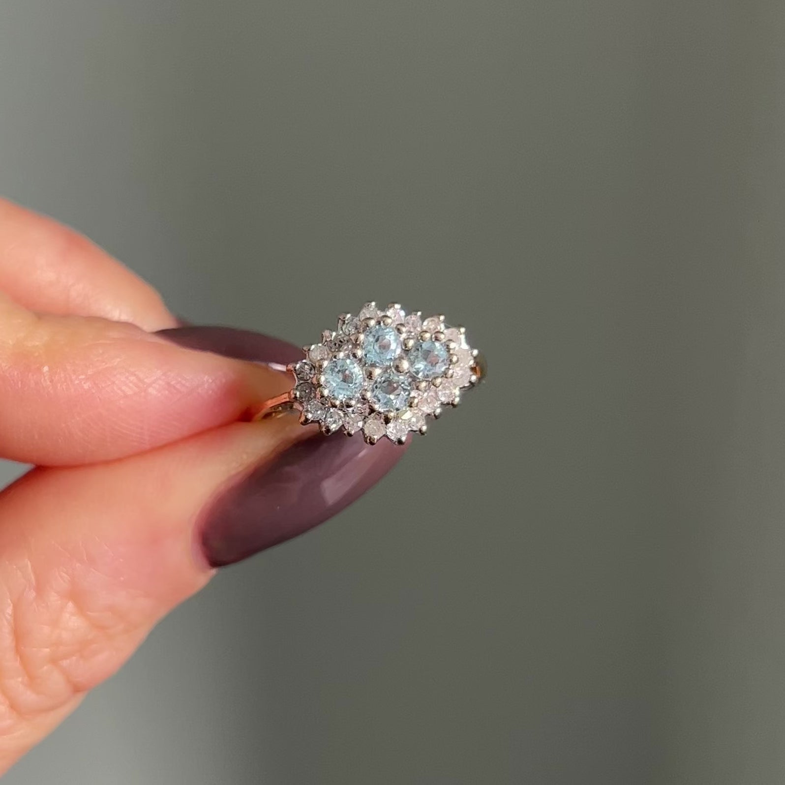 A dress ring featuring 4 round aquamarines surrounded by a cluster of smaller diamonds, all set in 9ct white gold on a 9ct yellow gold band. This is a preloved ring that is great as a dress ring but it also suitable for everyday.