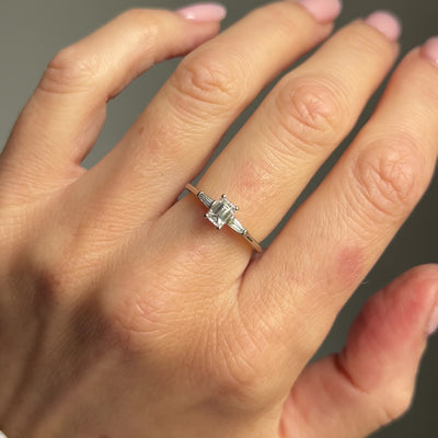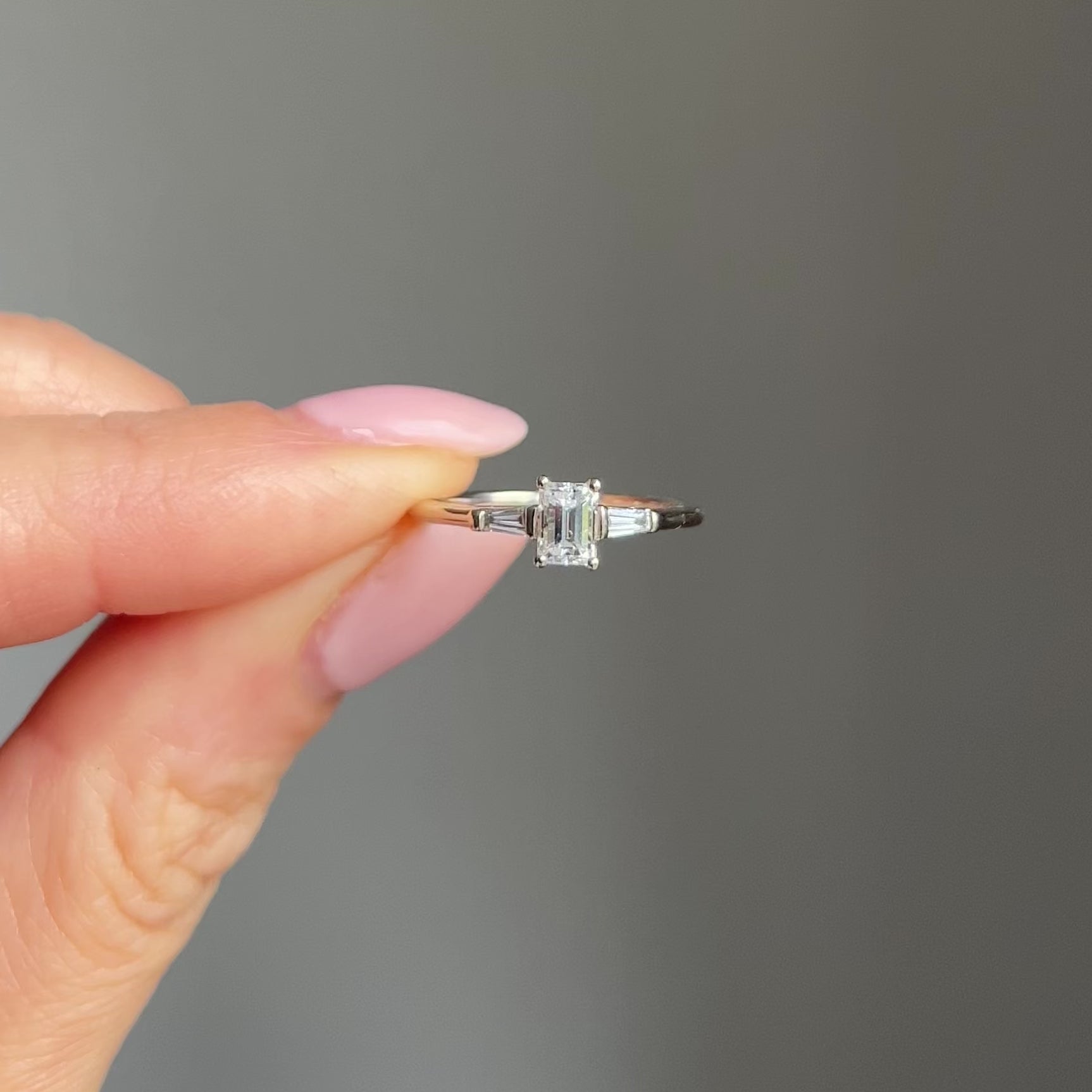 A dainty, very clean and crisp diamond ring, featuring an emerald cut diamond with a diamond baguette on either side. The diamonds are great colour and quality and look beautifully clear.
