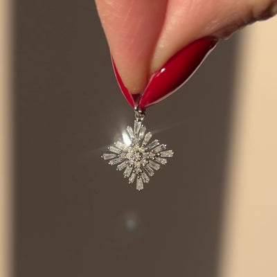 A diamond pendant styled like a beautiful glittering snowflake that has 33 diamonds in a mix of baguettes and round cuts.