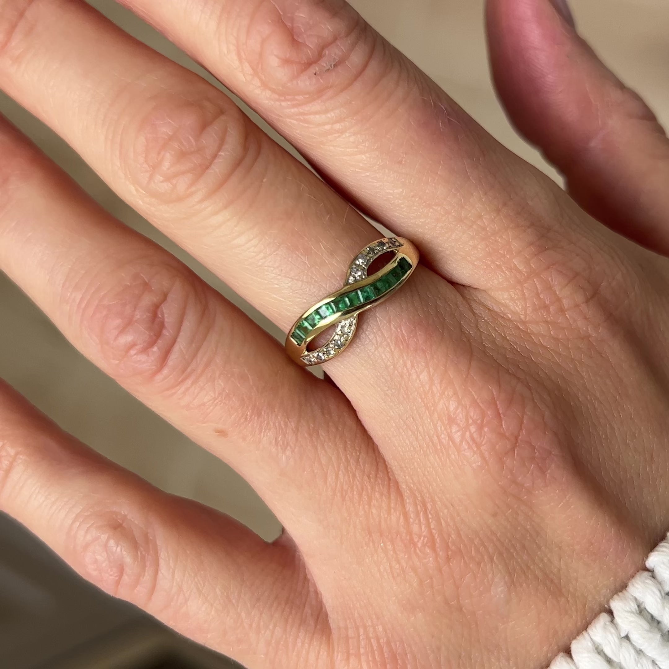 A wonderful diamond and emerald eternity ring, shaped like an infinity symbol. The emeralds are square cuts, channel set in 9ct gold.