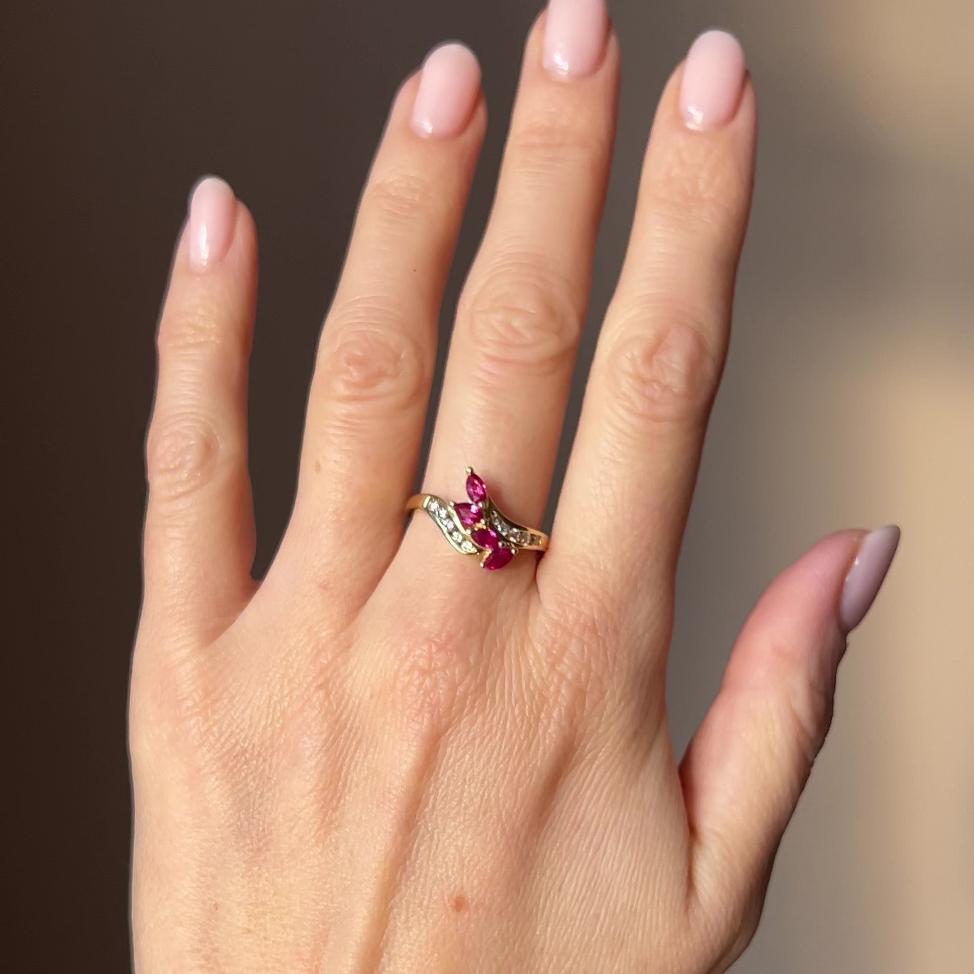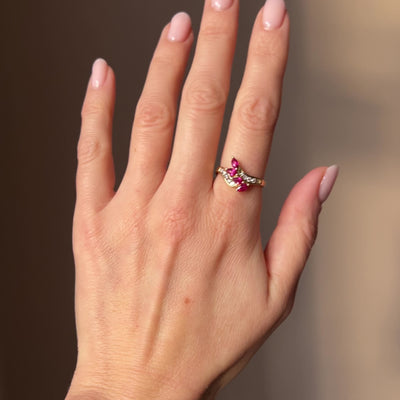 An ornate ring featuring 4 pear shaped rubies with 10 diamonds on either shoulder, and the shoulders are gently curved. The ring is crafted in 18ct yellow gold, which complements the rubies perfectly.