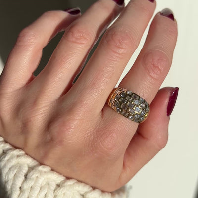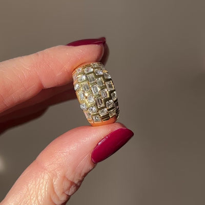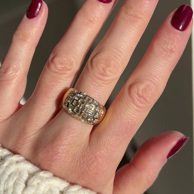 An amazing 18ct old domed ring, full of vintage character and charm. It's modelled in thick 18ct gold and has 1.35ct of mixed round and baguette diamonds of good quality. It's a great statement ring, easy to wear and beautifully made.
