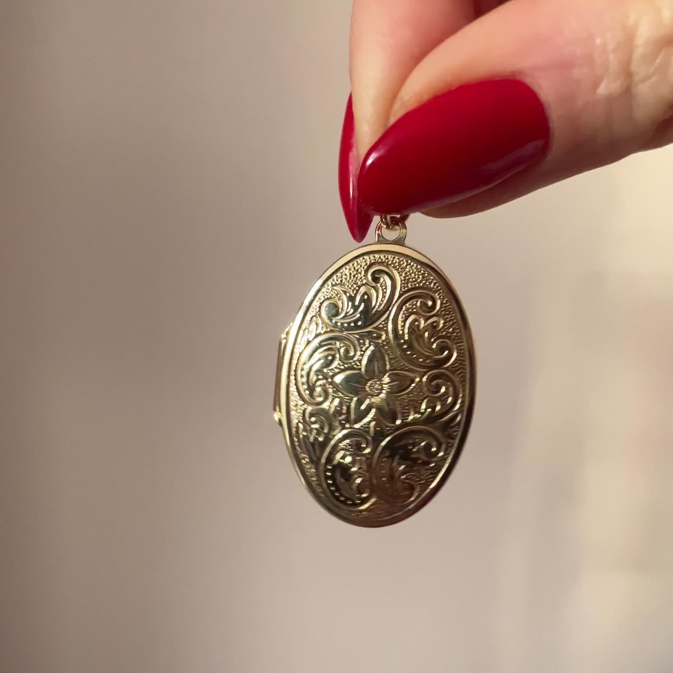 An oval vintage locket with floral engraving on the front and a polished back plate. The locket is hinged, and opens up and a keepsake can be kept inside, close to your heart.
