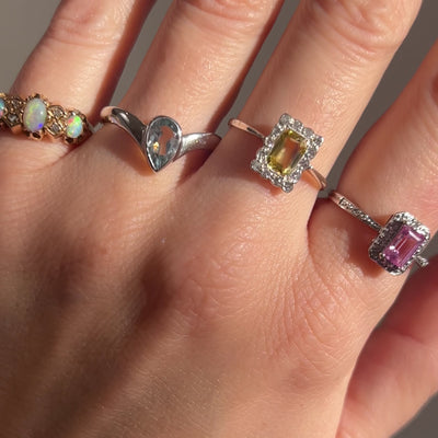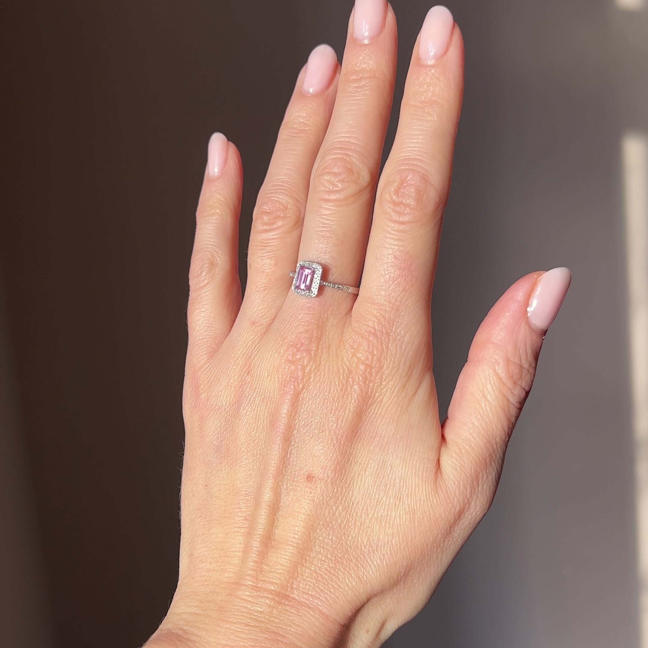 This charming pink sapphire ring is pure joy. The gorgeous emerald cut stone sits pretty at the centre, dressed up in a clever illusion set border that makes it look even more dazzling than it already is. Crafted in 9ct white gold, it's the kind of piece that catches the light, and compliments, wherever you go.