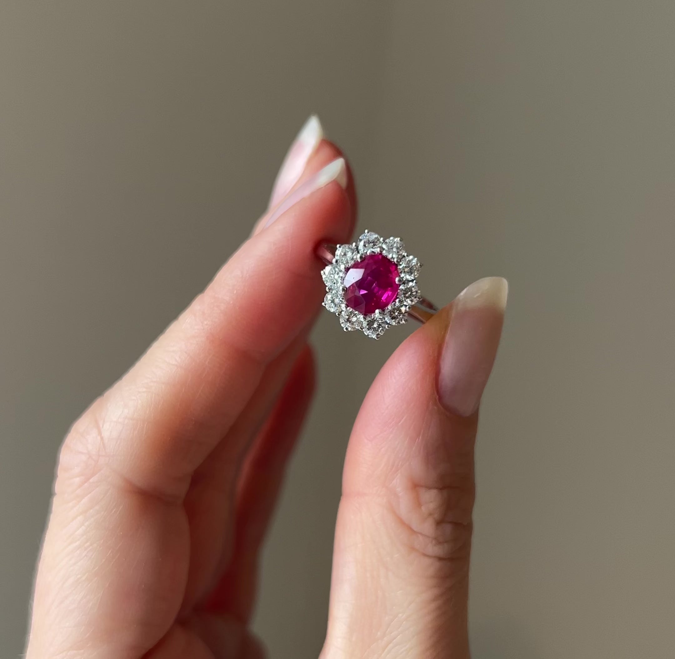 A 1.48ct natural Burma ruby sits in the centre of a diamond halo in this stunning ring. The ruby is a deep and intense red with hints of pink, and the diamonds are bright. This ring is a good size on the hand without being too bulky, and a wonderful statement ring.