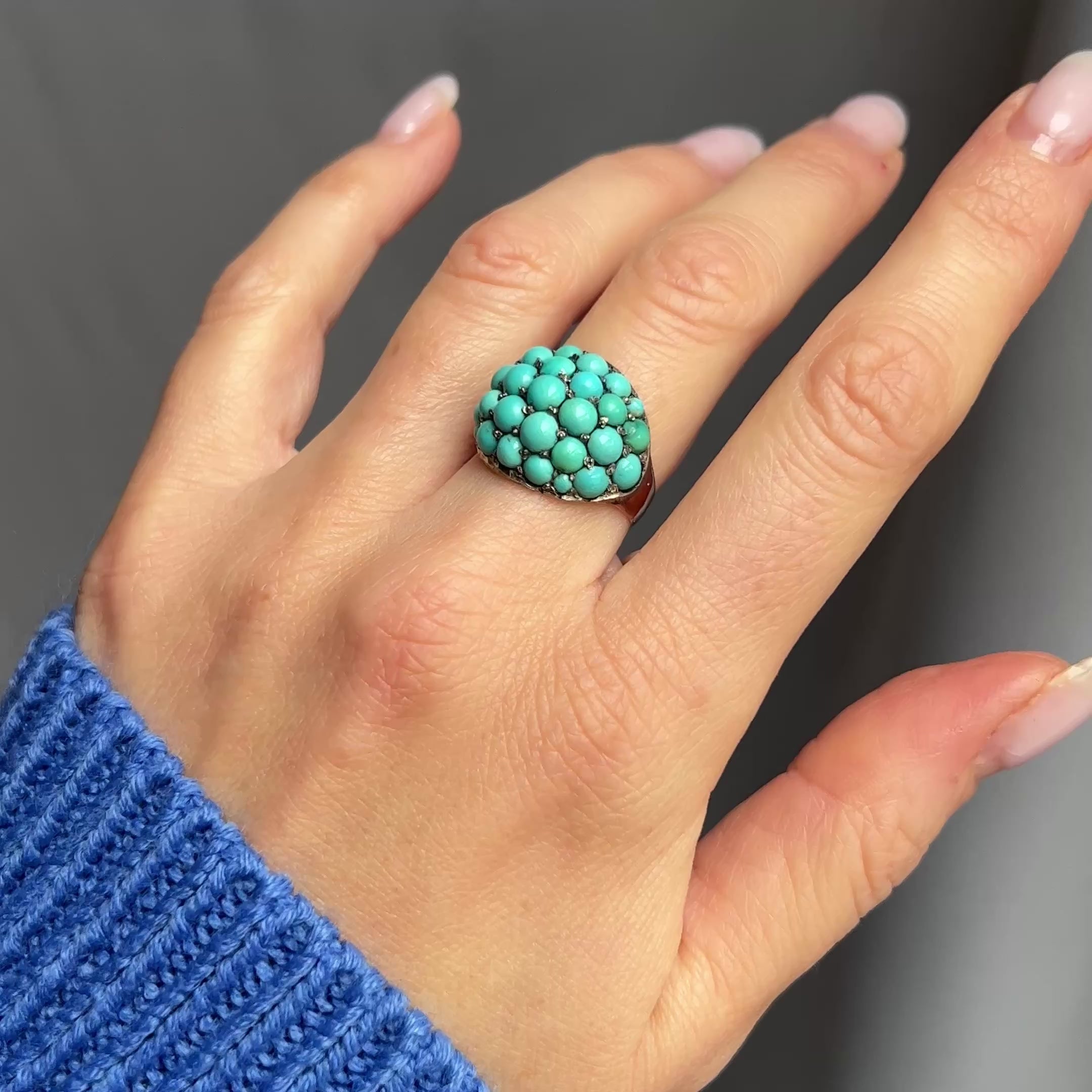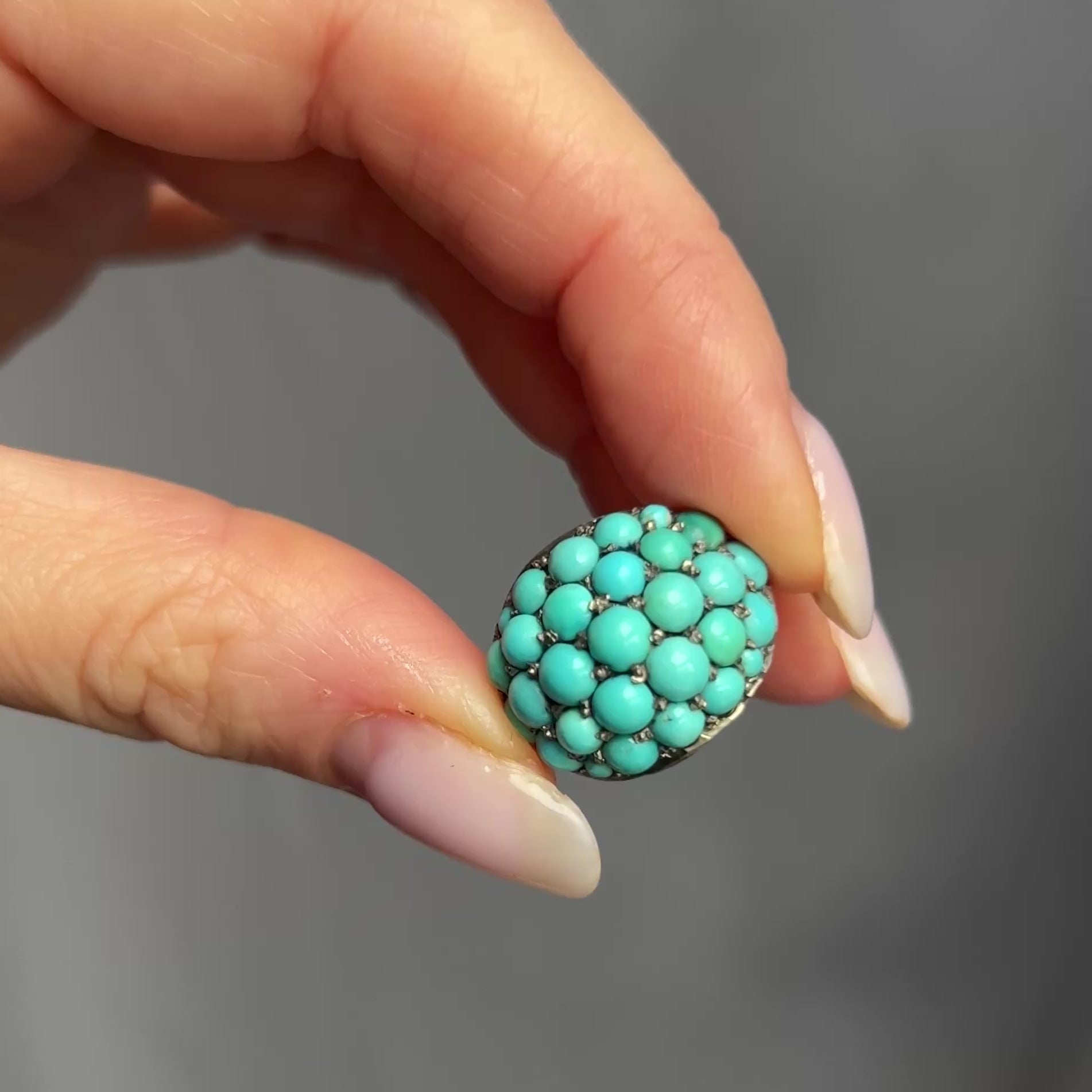A fabulous antique turquoise bombe ring, set in silver on a gold band as is typical of the era. Judged to be Victorian to early 20th century.