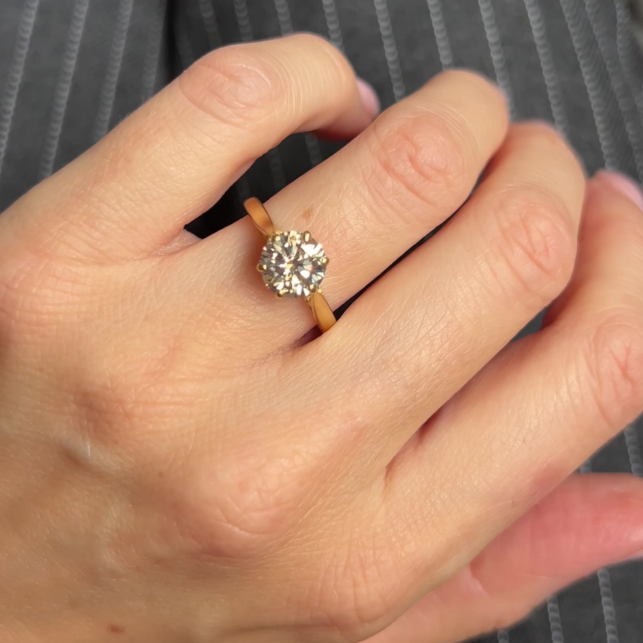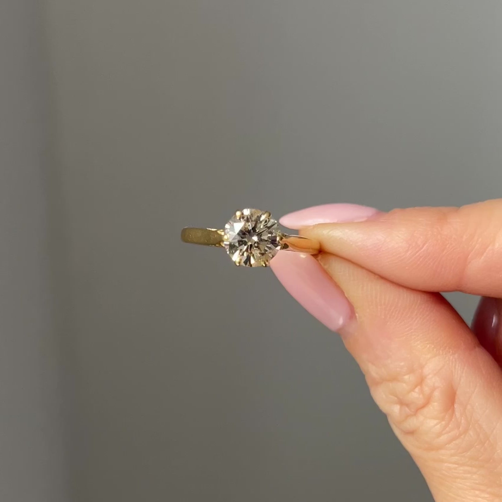 A vintage classic diamond solitaire ring, featuring a natural 1.70ct diamond which has been certified as a 'fancy light yellowish brown', so it has a lovely warm tone to it. (Please see the videos to see the most realistic representation of the colour, as it presents differently in different lights). It does have some inclusions, as per the certificate, but it is priced accordingly, so it is great value for a ring of this size.
