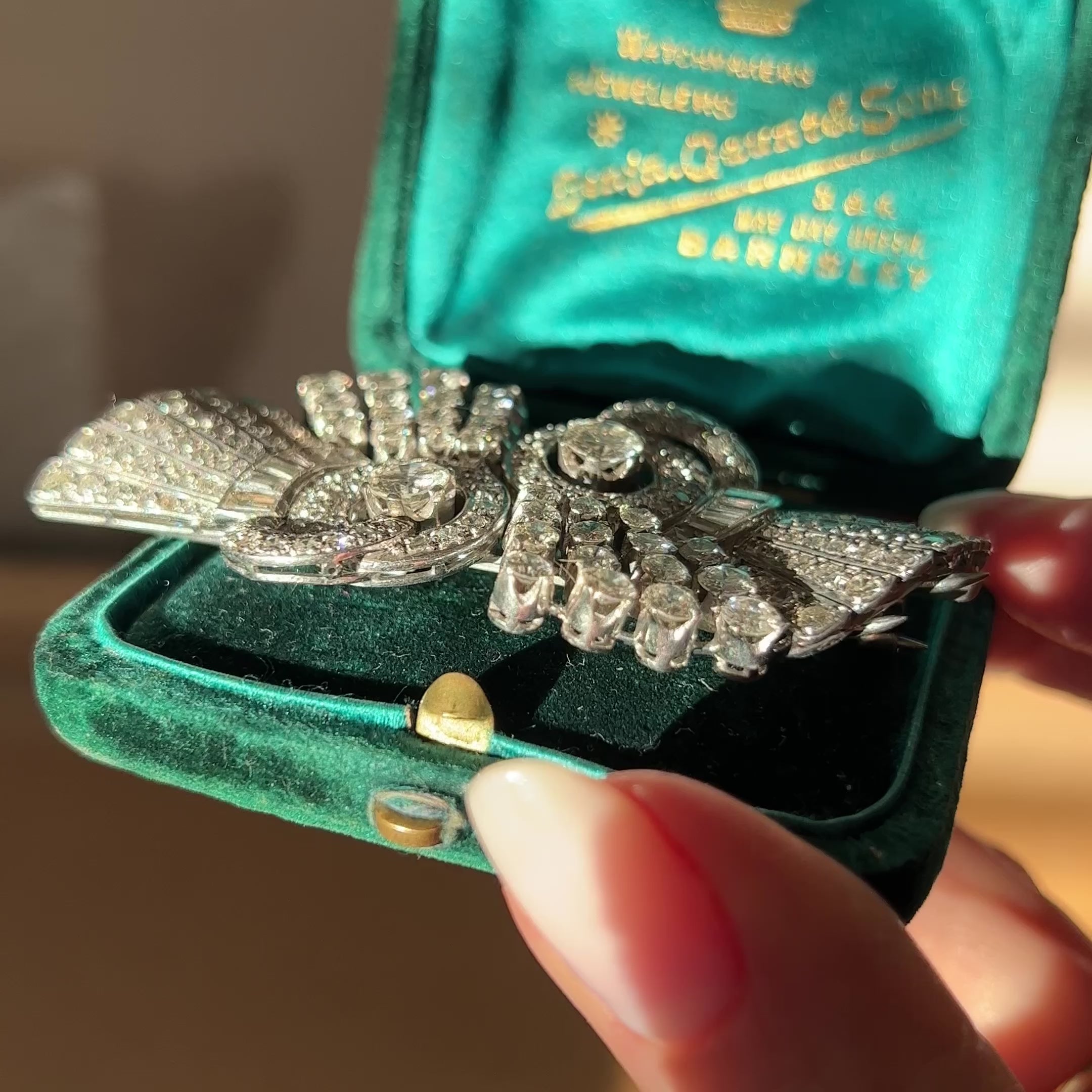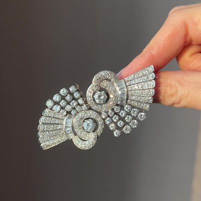 Bring back the brooch! Especially when they are as special as this one. Featuring over 200 mixed cut diamonds, weighing a total of 10.00ct, the design is what is described as a 'duette' brooch, which is made up of 2 clips which come together on a brooch bar, and can be worn separately as clips on a lapel, hat, bag or shoe! - or together as a statement brooch - however your fancy takes you! This style of brooch was most common during Art Deco and Art Nouveau periods, celebrating modernity and machine aesthetics.