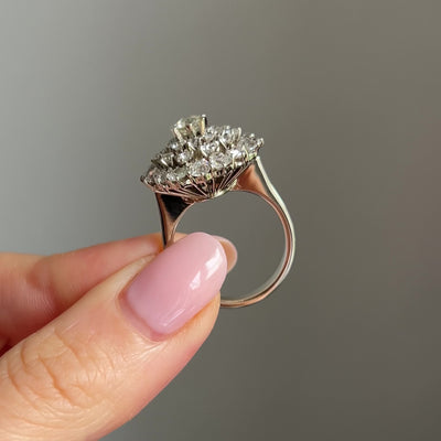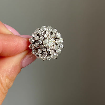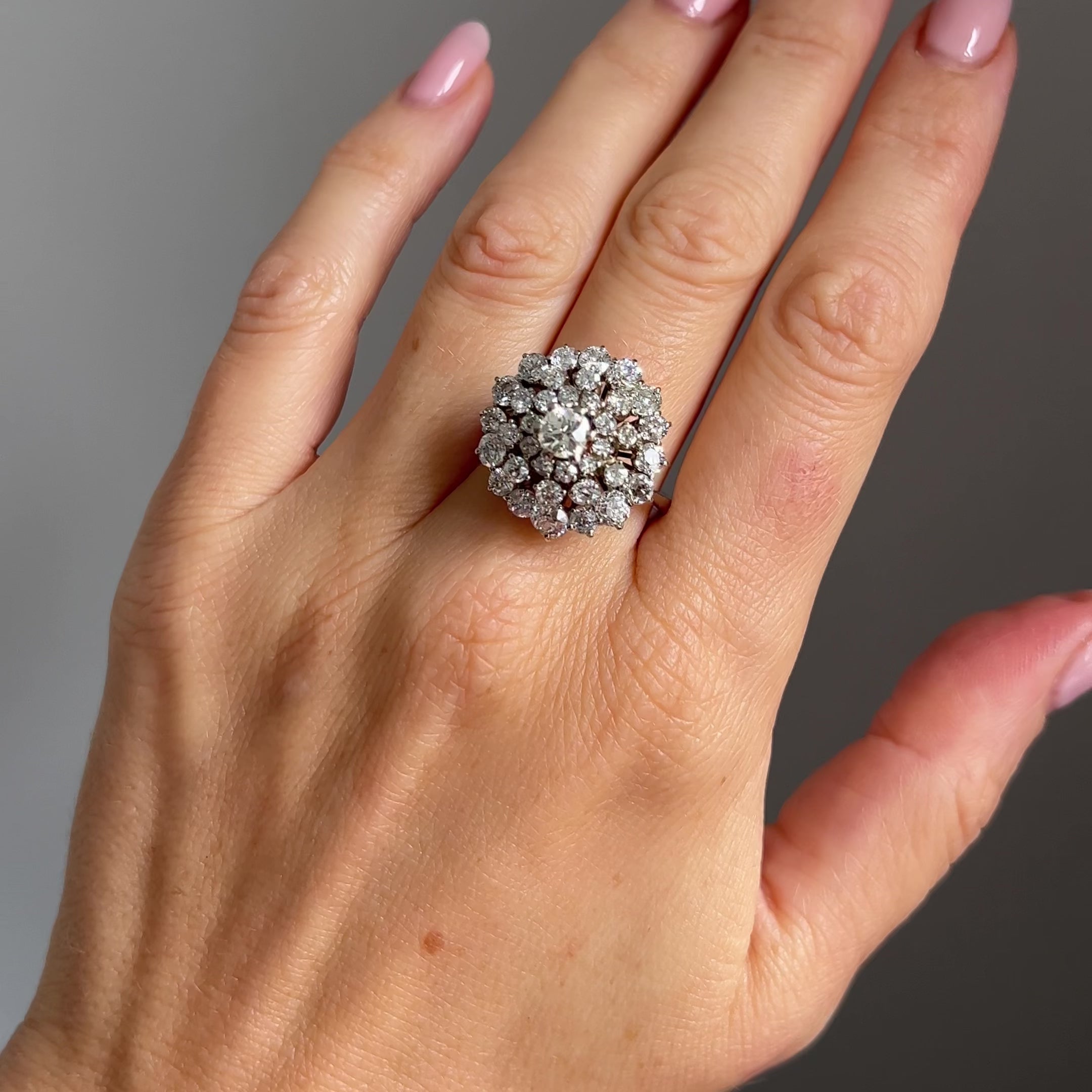 A beautiful diamond statement ring, with a riot of 2.50ct of diamonds all set in 18ct white gold. There are 37 old cut diamonds set at varying levels, creating a pyramid style of setting. It's extravagant and stunning.