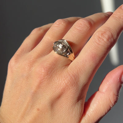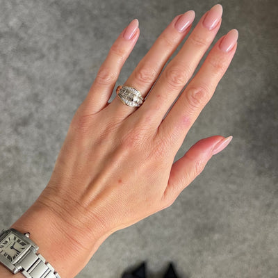 A wonderful vintage ring with a curved face, set with 3 rows of straight diamond baguettes set in white gold with a yellow band and surround. It’s nice and chunky, but with sleek lines giving it a 90s feel.