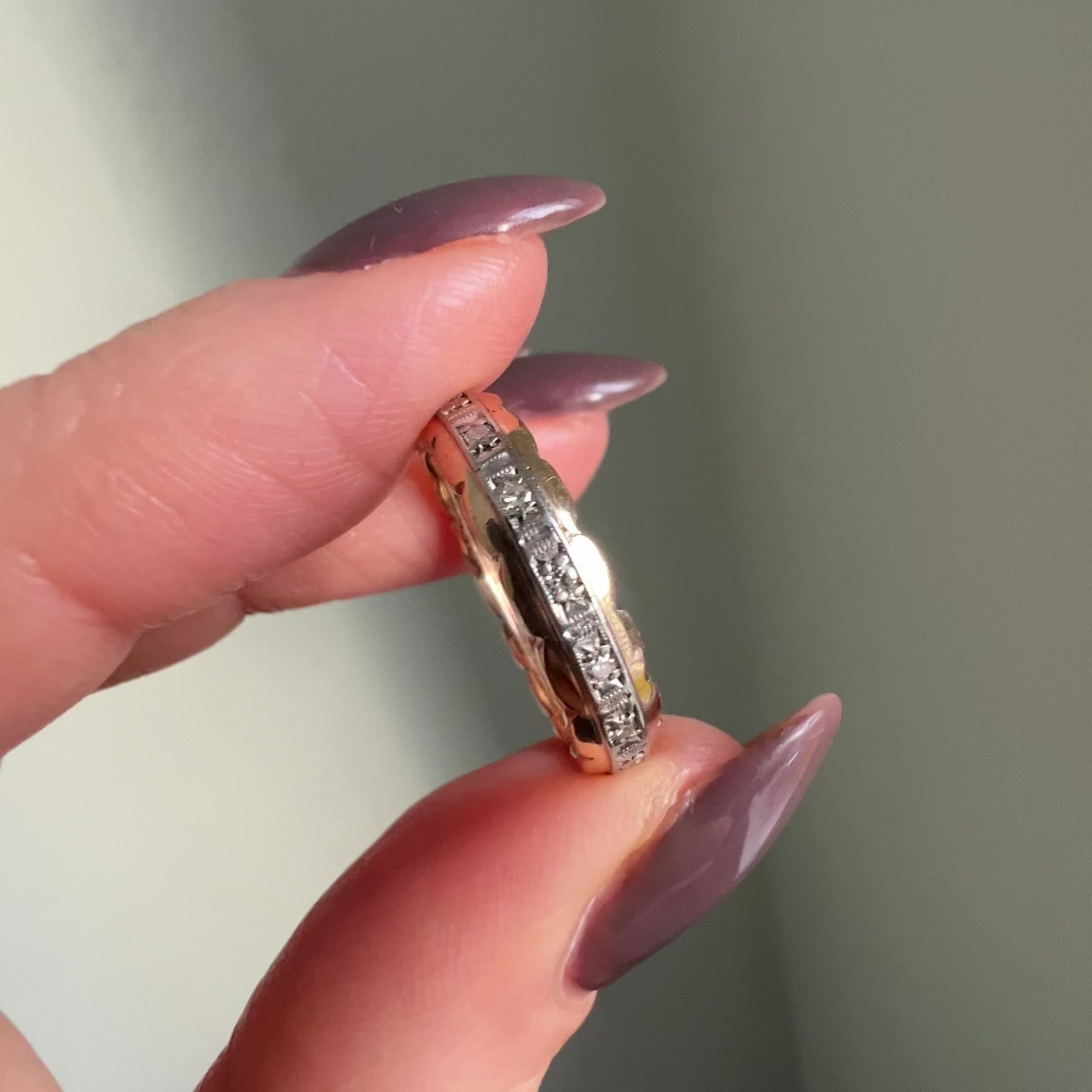 A pretty band cast in 9ct white and yellow gold, with small diamonds all the way around, and with a scalloped edge.