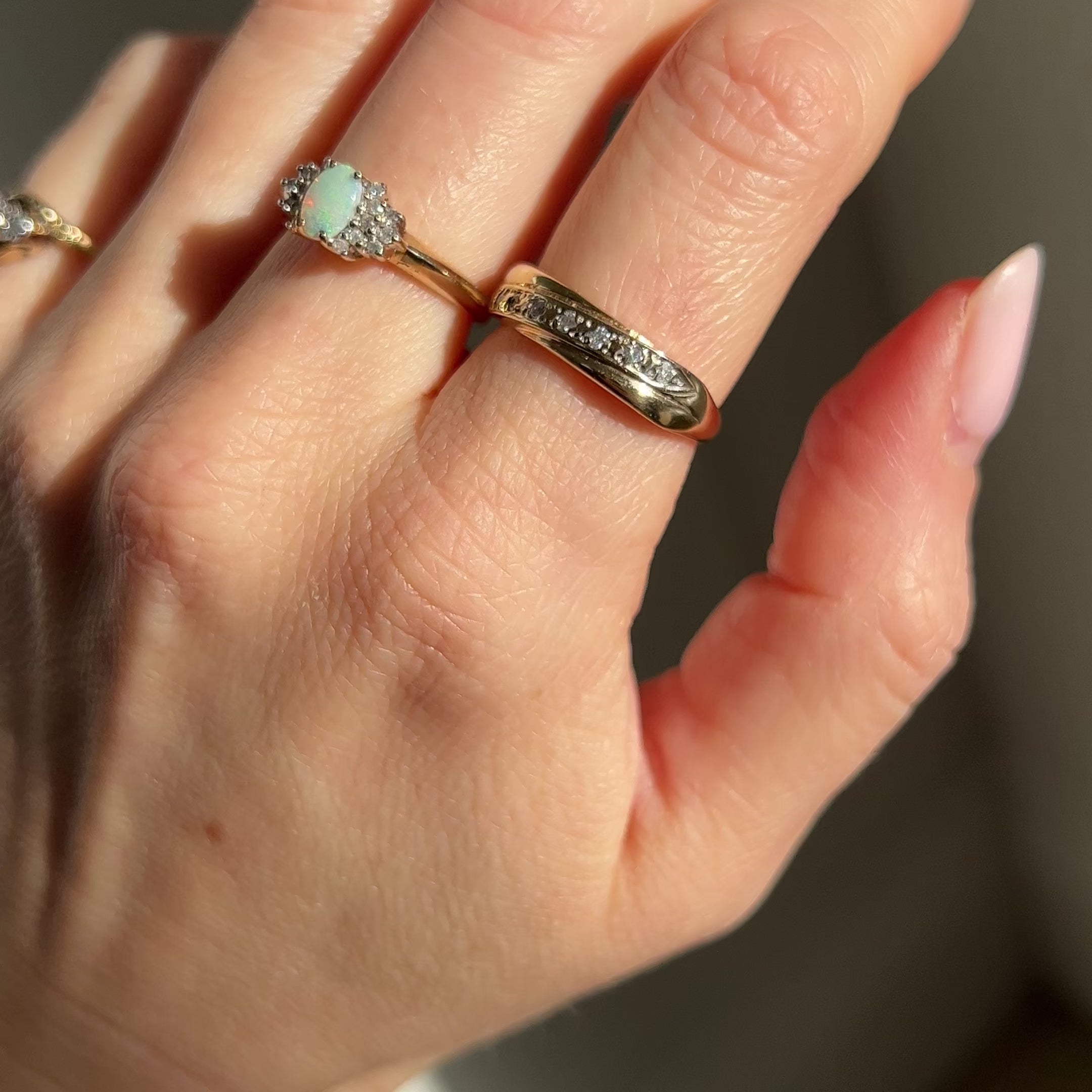 A vintage 9ct gold cross over band with 7 diamonds, perfect for everyday wear and stacking with other rings, and a great buy if you want a solid band that will last.