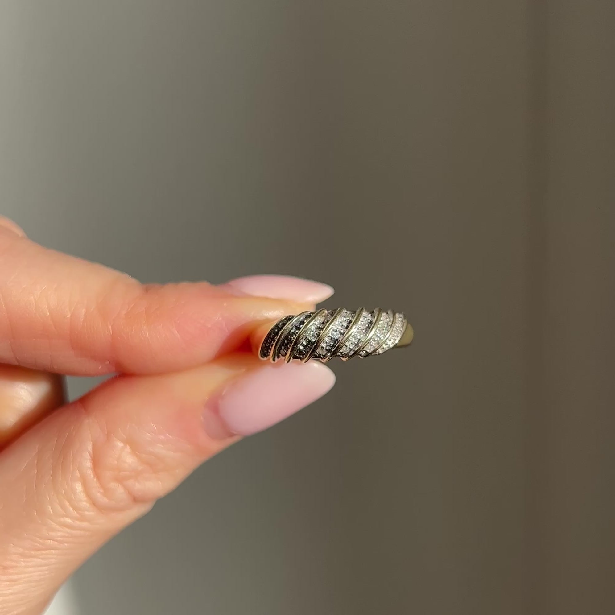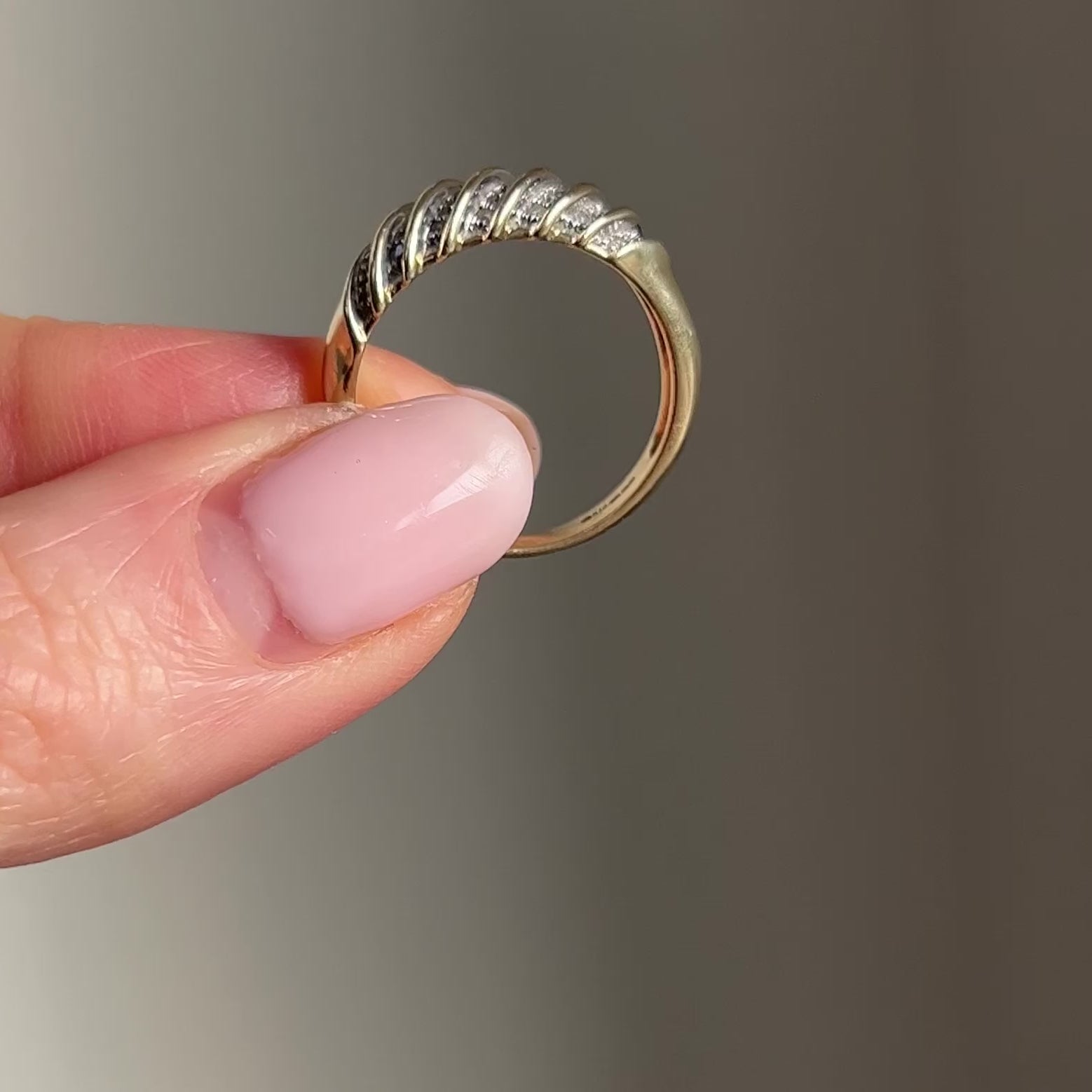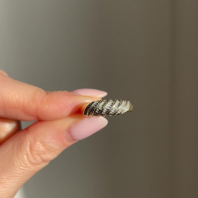 A very wearable and great everyday vintage gold and diamond band. It's slightly domed and features lovely pave diamond details in 7 sections The ring dates to the 1990s.