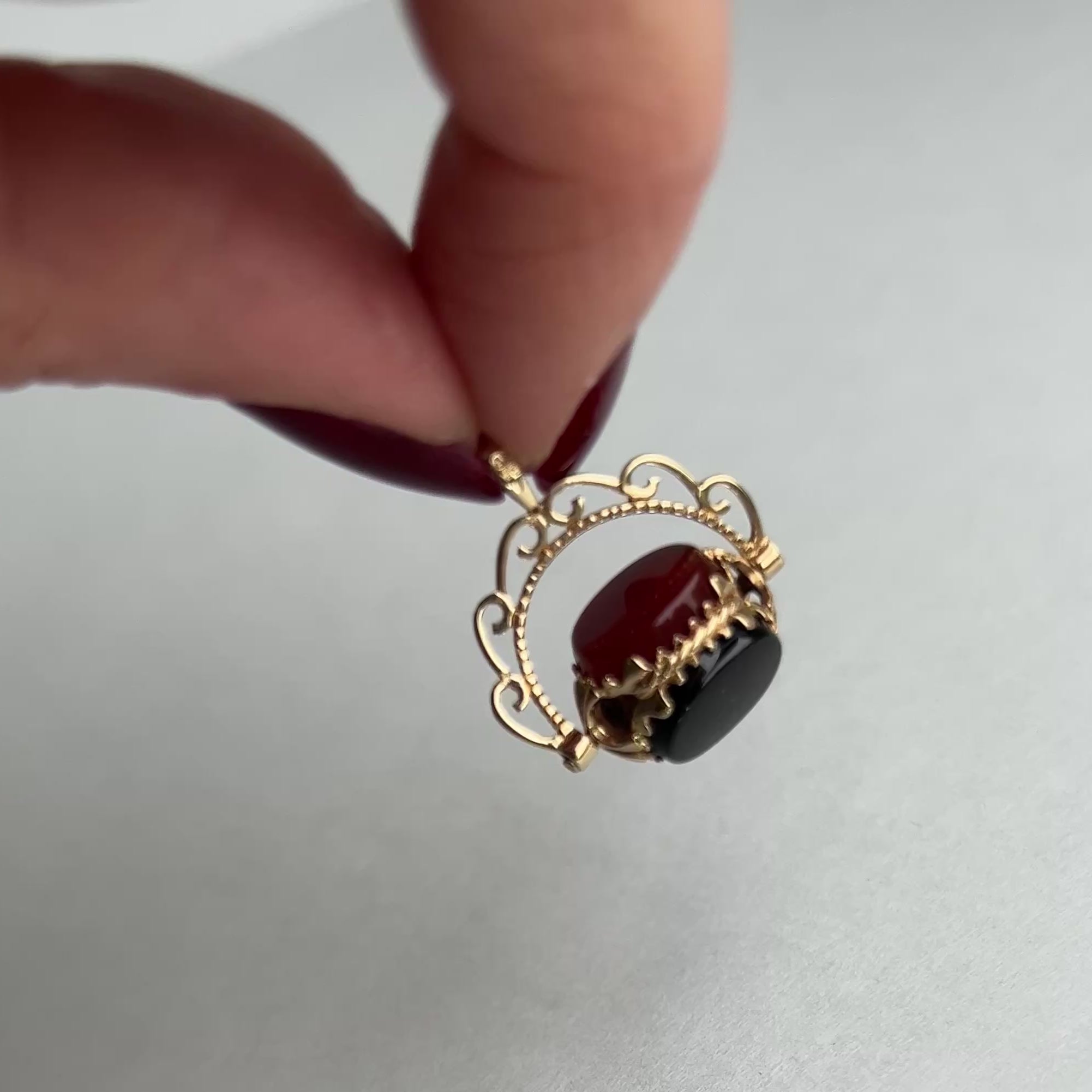 A vintage spinning fob with 2 sides of onyx and 1 side of carnelian, set in an ornate 9ct gold design. It's a pretty piece that would make a lovely pendant on a long chain.