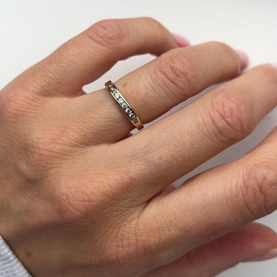 A dainty half eternity diamond band, with 9 channel set diamonds in 9ct gold.