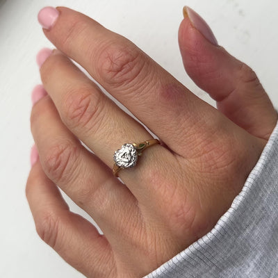 This vintage ring has a white gold heart, with illusion set diamonds on a 9ct yellow gold band with pretty shoulder details.