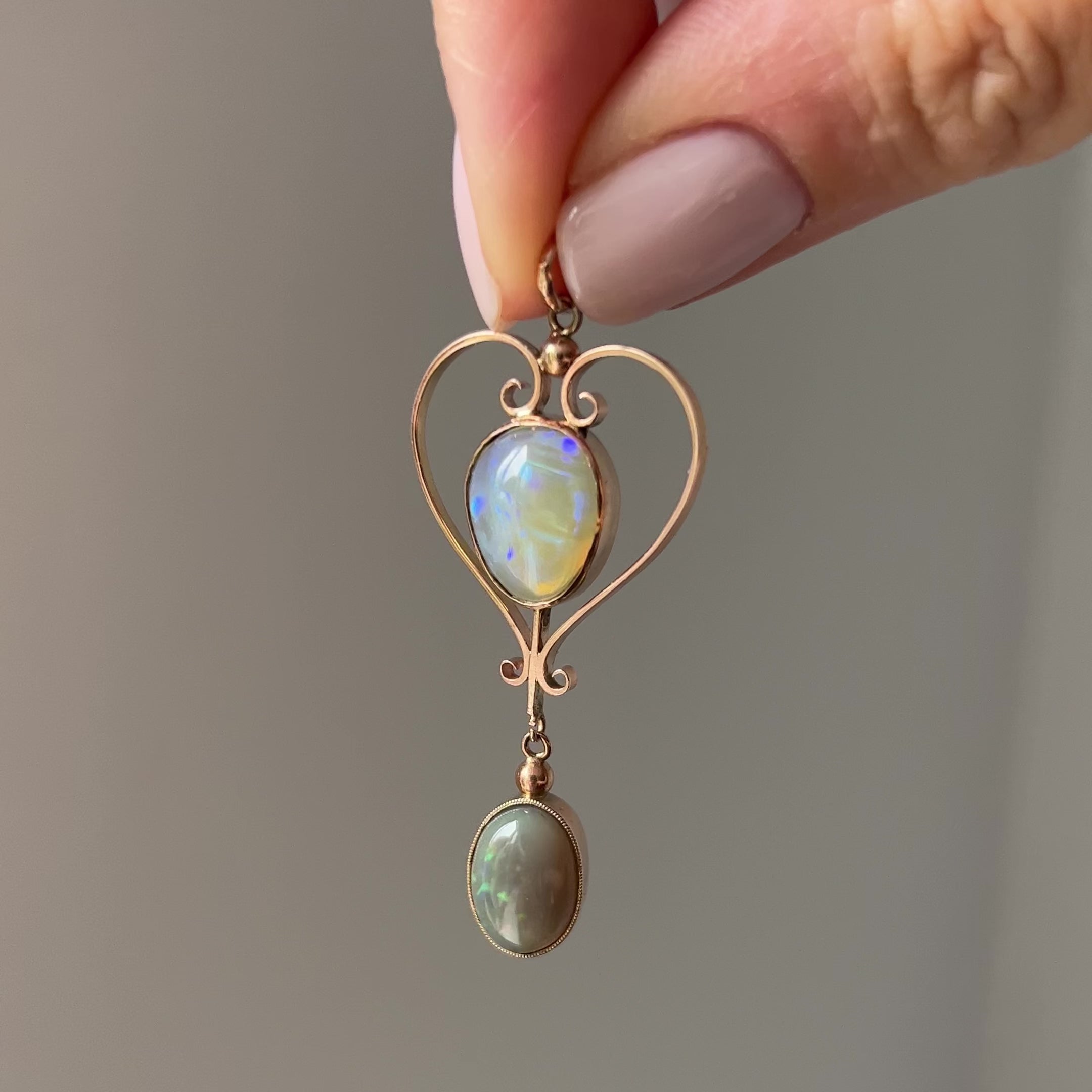 A beautiful art nouveau pendant, featuring all the beautiful curving lines you’d expect of this design period. There are 2 oval opals, the top opal is lighter and shows greens, blues and yellows and the bottom opal is a darker green / purple. It hangs elegantly and looks beautiful when worn.