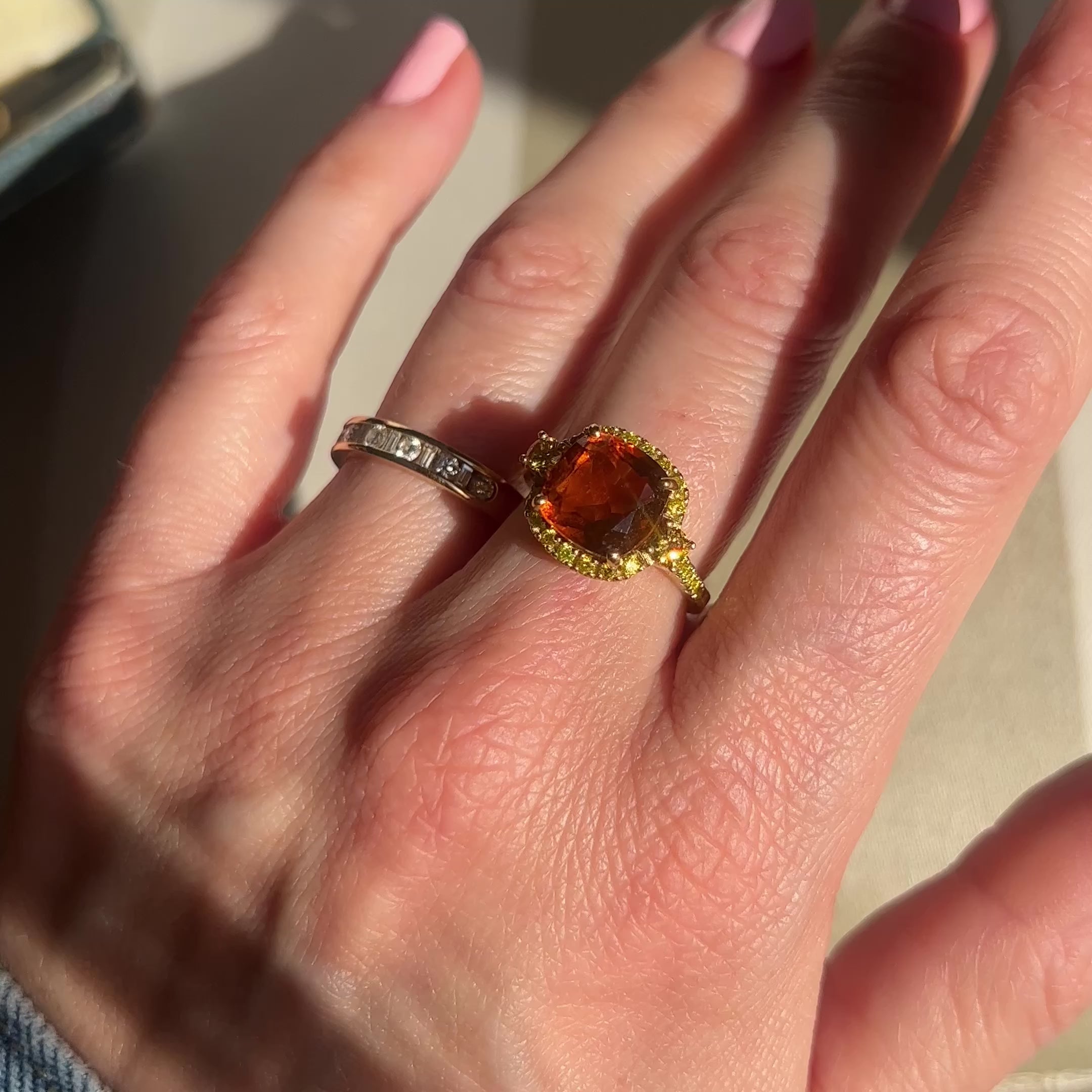 A richly coloured Maderia Citrine sits in the centre of a yellow diamond surround in this beautiful cocktail ring. Madeira citrine is the most coveted type of citrine due to it's golden hues and is named after the island of Madeira's famed fortified wine. The gems are set in 18ct gold, adding to the overall golden shimmer!
